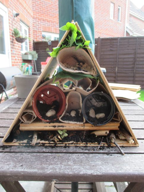 The ‘floor’ above was created with a curved piece of cardboard which could then hold leaves, another paper mache pot and more cubby holes. The finishing touches of soil, dried leaves and dandelion leaves were added and there we have it, a homemade bug house ready for the garden: