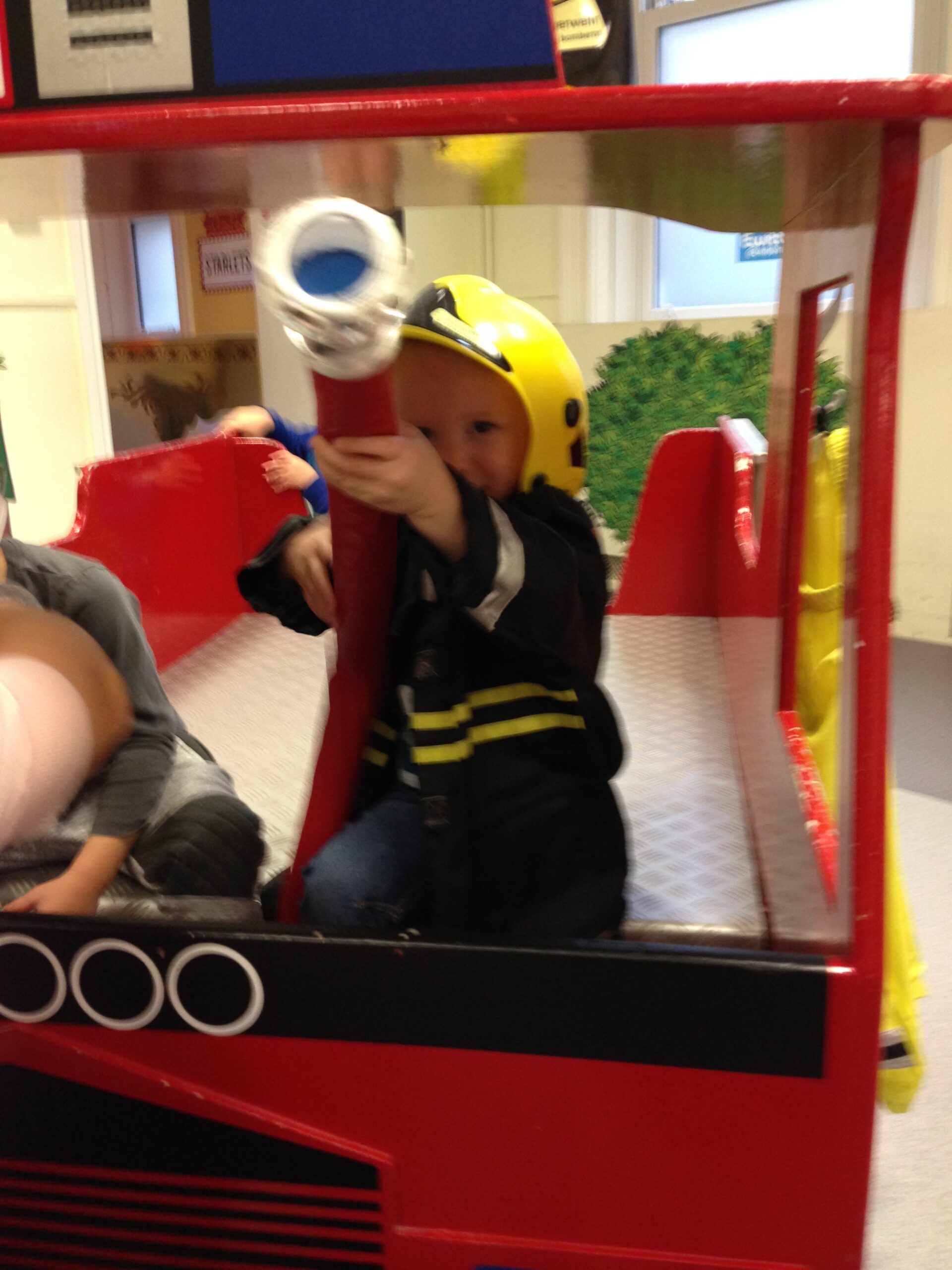 Jake at Little Street doing the activities being a fireman, sitting on a digger and working in the shop