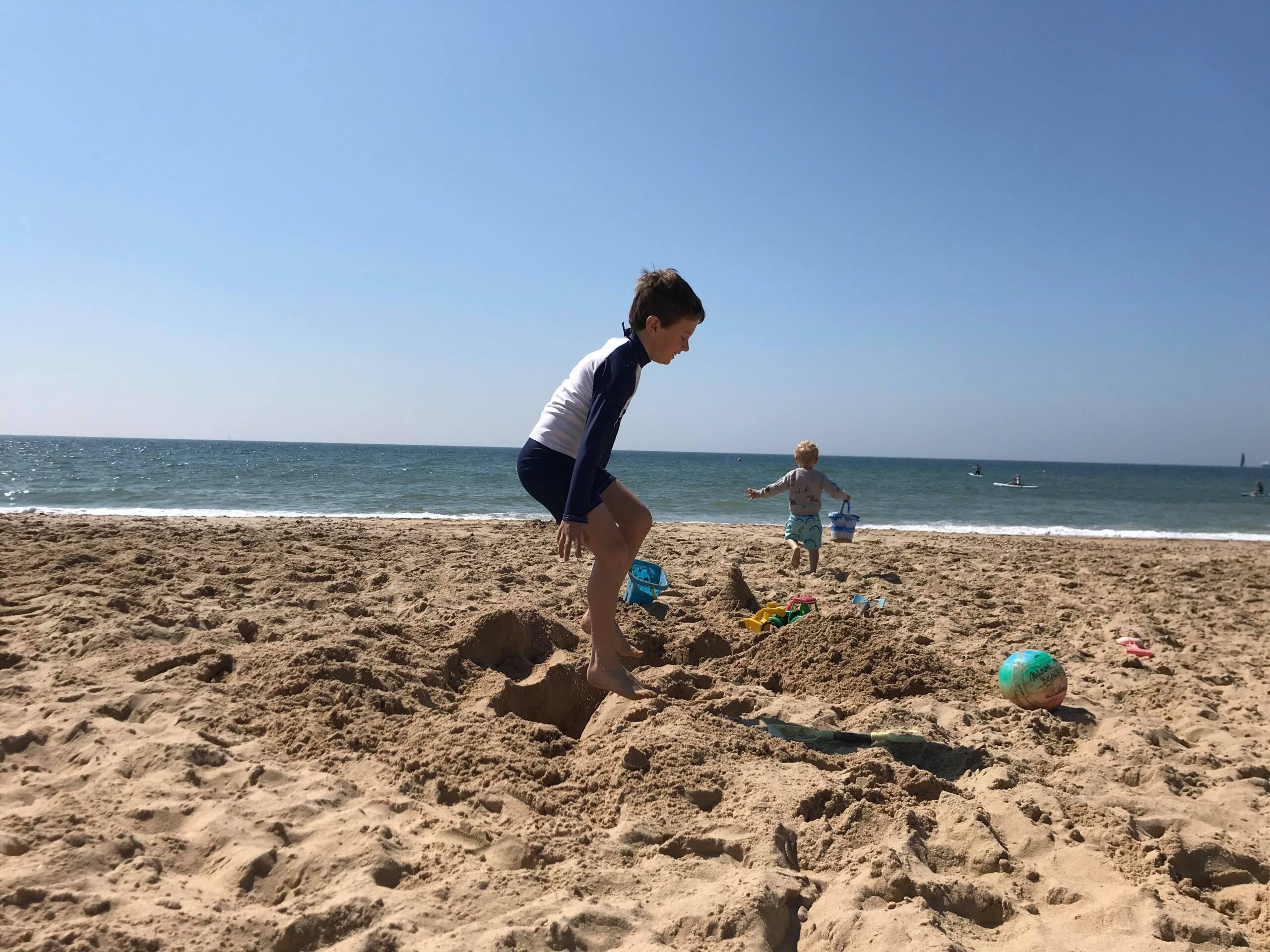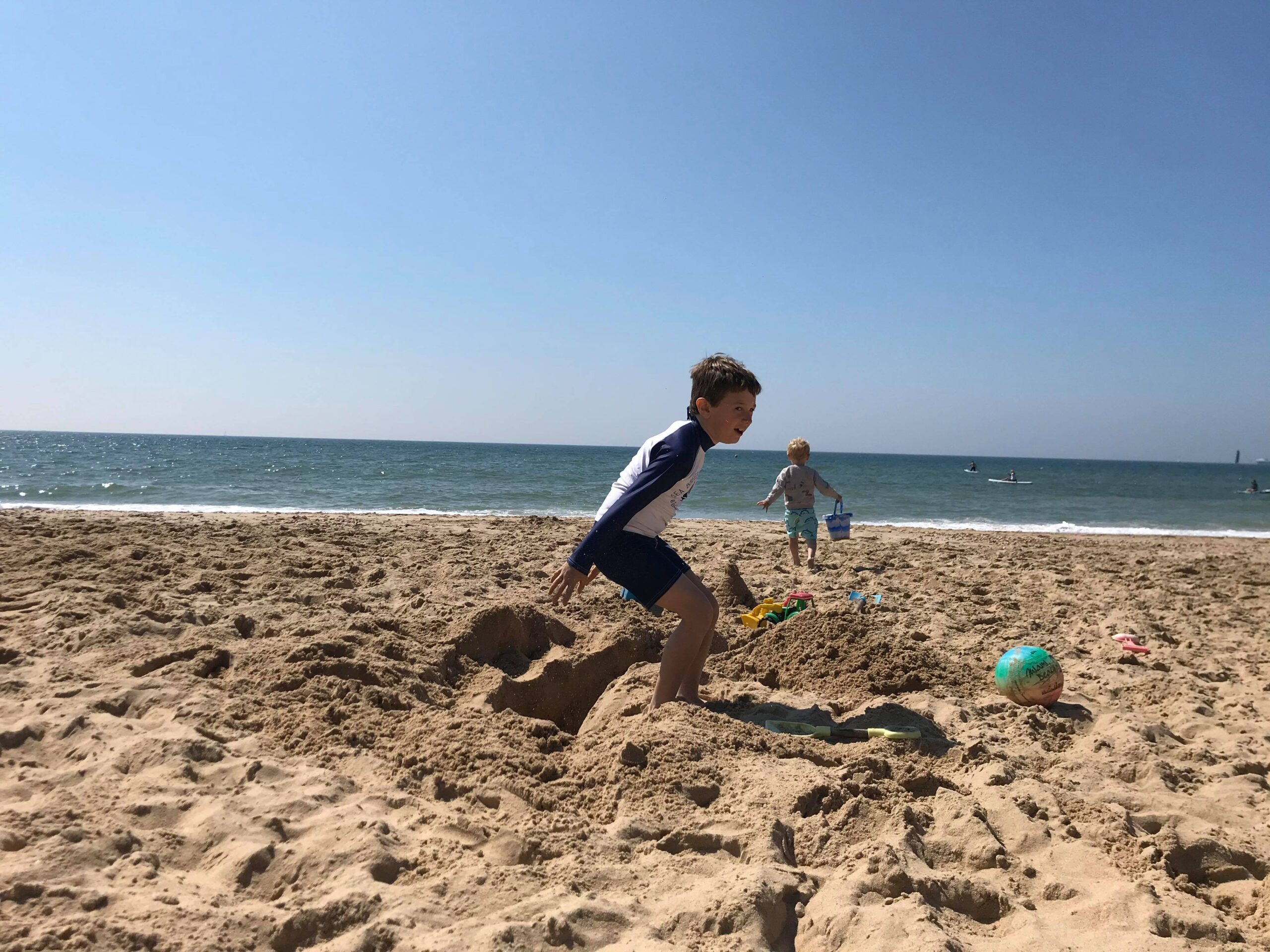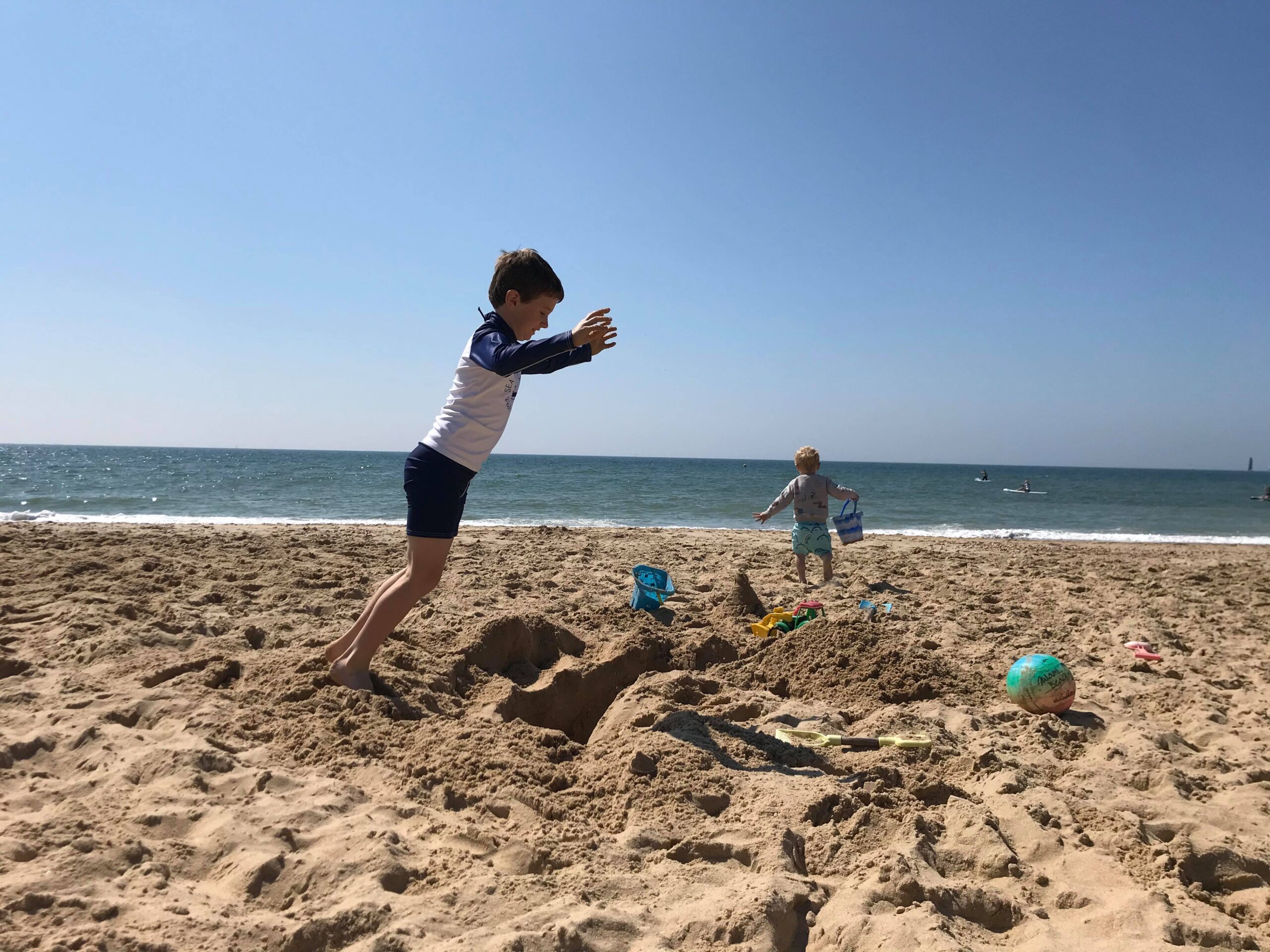 He was straight into the sea, splashing around and running away from the waves. He was comfortable and protected which I was very happy about considering how hot it suddenly became.
