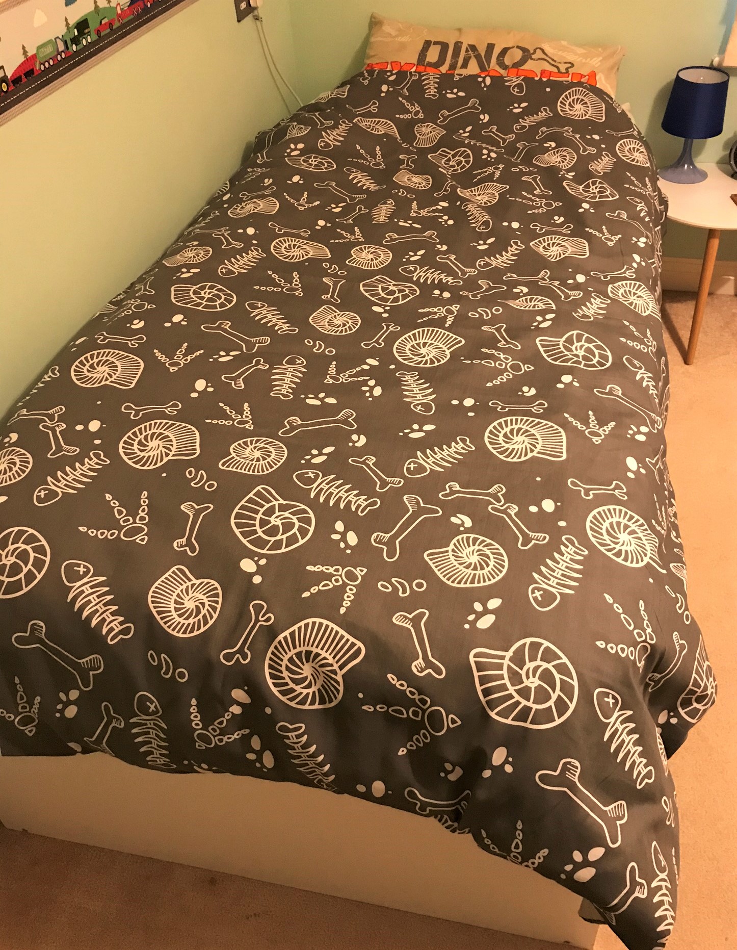 Jake chose the Raptor Dino bedding set (obviously!) and he was over the moon that it was a skeleton design (boys, eh?!) Nope, this isn’t your usual cutesy, brightly coloured dinosaur bedding. It is bold, factual and more grown-up which is perfect when your 5-year-old thinks he is a teenager!