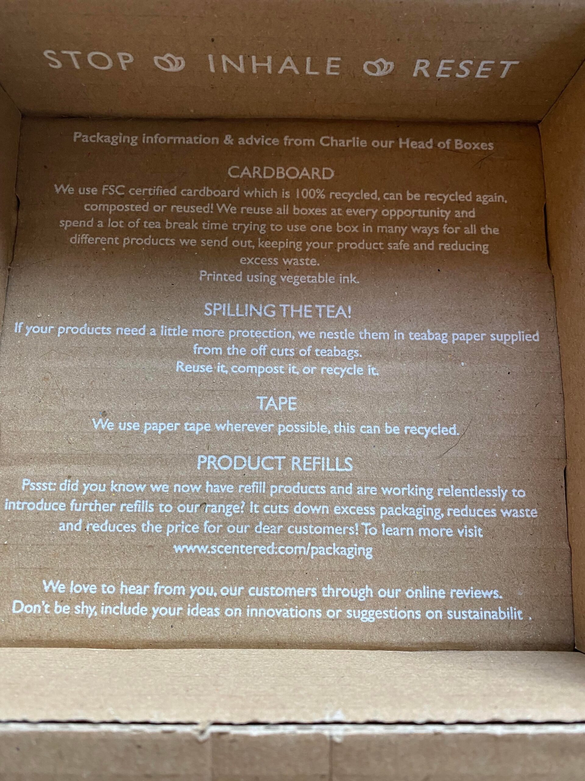 As an eco-conscious person, my first thoughts often go to the packaging and Scentered did not disappoint. The products arrived in a cardboard box with paper tape and each product also in cardboard. I love the touch of having eco-tips on the bottom of the box to help the customer make good choices about using or disposing of the packaging. You can read more about their sustainability practices here.