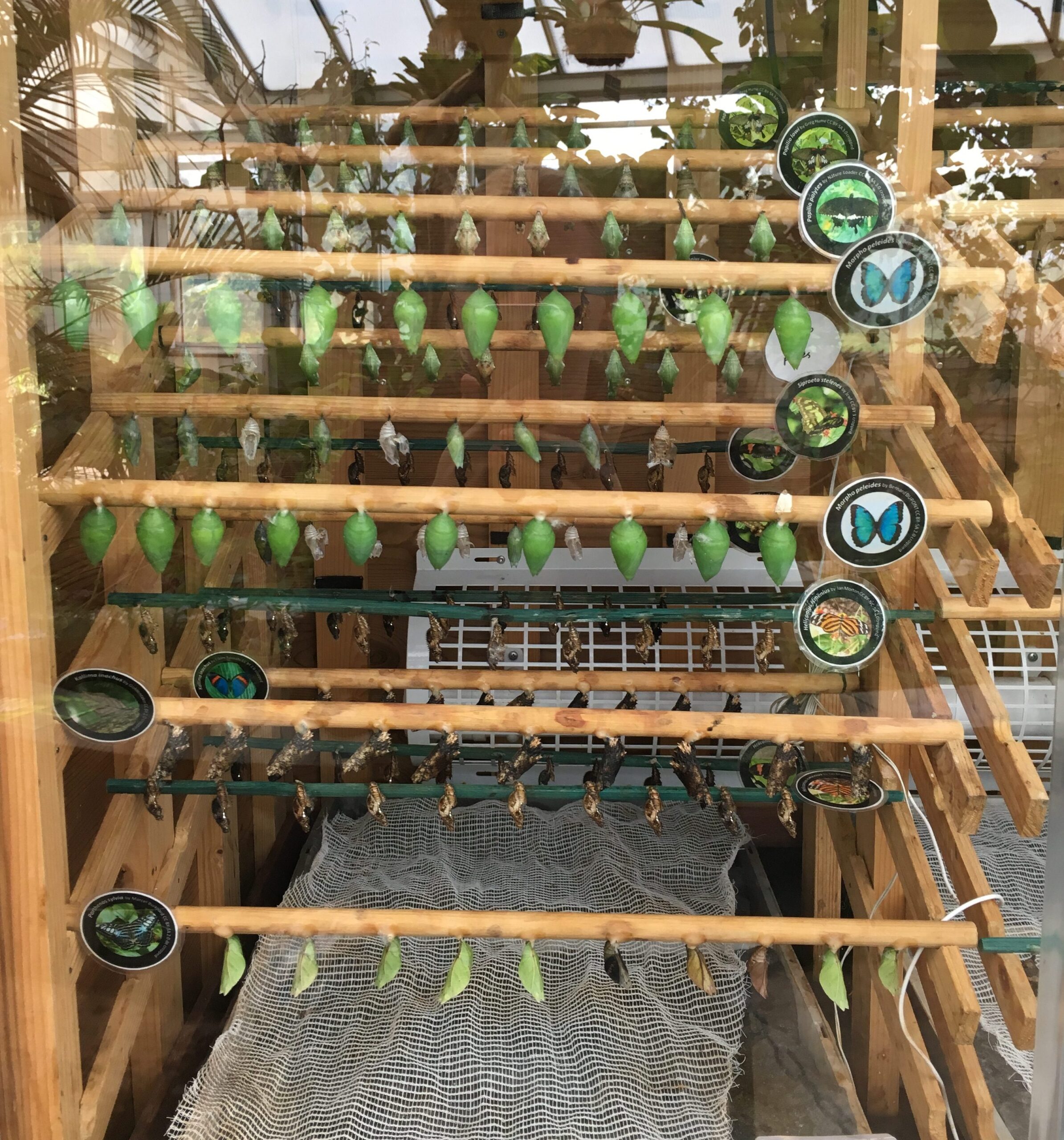 Feeding the ducks came first, of course, but then I very excitedly dragged the boys off to the butterfly house. The number of butterflies inside was astounding. I was only expecting a handful of varieties yet flying all around us were not only native butterflies but also foreign ones that are imported in as caterpillars or cocoons. We were lucky enough to be shown around by the member of staff… because we had a cute child with us! and we were shown where some of the caterpillars were hiding, where the native cocoons were attached and then to the cabinet with the imported ones. We were then fortunate to see a butterfly who was ready to be released from the cabinet having just transformed.
