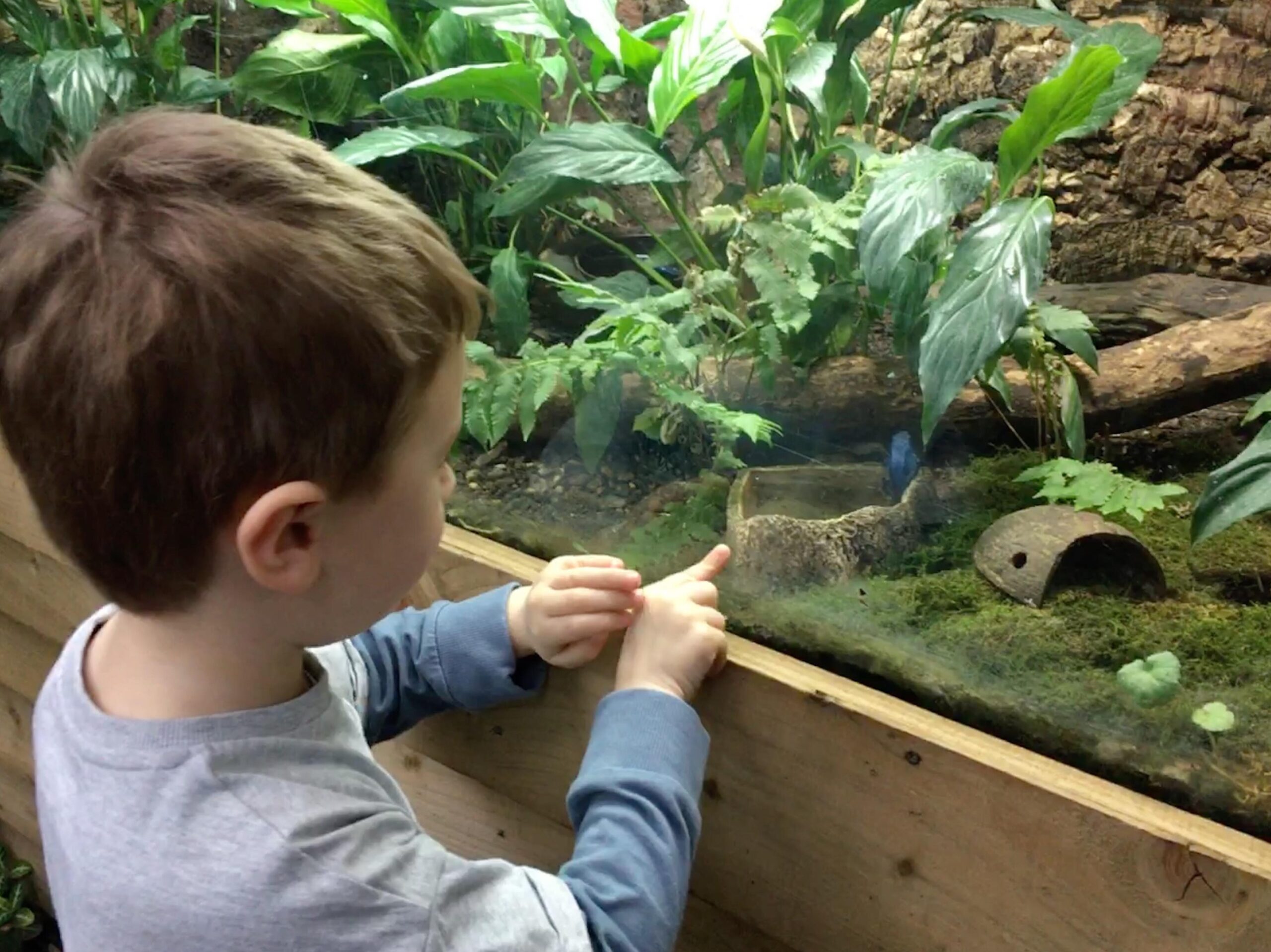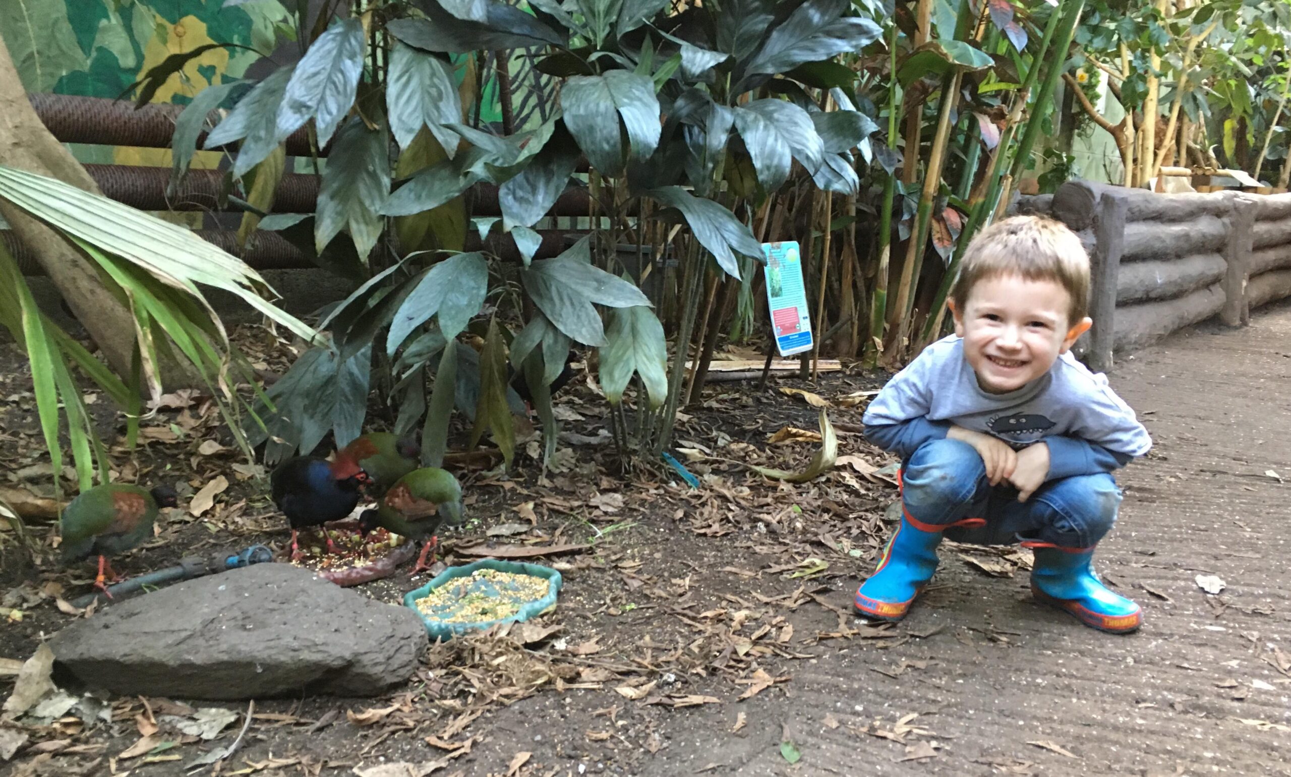 As you enter the rainforest the first thing you notice is the temperature. I would recommend leaving your coats in the car because the longer you spend in there, the warmer you get! As it is humid, it is also damp so I would also leave your best shoes behind. We always put Jake in wellies so if there are any puddles he can walk straight through them. Another point to note is that it is pushchair and wheelchair friendly, although the pathways are narrow and people can be reluctant to move out of your way, so it may take a little longer to get around but as the centre is open 10am-5pm and you can pop in and out to the cafe or outside play areas, you have plenty of time to enjoy everything they have on offer.
